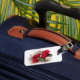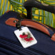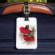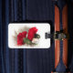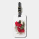 Die Rückseite dieses Gepäckanhängers lässt sich leicht anpassen. Auf einem perlenweißen, brokierten Stoffhintergrund befindet sich ein Set aus zwei glänzenden roten Nelken. Machen Sie Ihr Gepäck auf einem Carousel am Flughafen auffällig!
