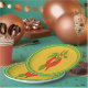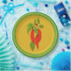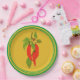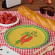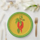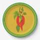 Paprikaschoten mit heißem Chili auf Senfuntergrund. mexikanischer Stil. Ideal zum Party, wo mexikanische Gerichte serviert werden. Drei Grenz-Grünringe. Chili Paprikaschoten mit grünen Blätter auf Rebsorte mit kleiner Blume.