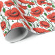 Papier in ein zartes Muster von lebhaften roten Pappeln mit tiefen grünen Stielen und Blätter, auf einer Weile Hintergrund, mit jedem Mohn blühen einzigartig gekrümmt und verdreht, als würde es sanft in der Brise schwingen.