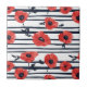 Eine wunderschön gestaltete Keramik-Kachel mit kräftigen roten Mohn-Blume mit cool blauen Blätter, Set gegen blaue Streifen. Die Komposition verbindet eine moderne Streifenästhetik mit zeitlosem blumigen Charme, naturgetreuen und Retro-Vibes, ideal für den Frühling und den Sommer.
