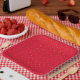 Rote Platte mit sonniger Erdbeerhintergrund Pappteller