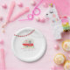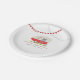 Teller, der eine blaue Illustration eines roten Vintagen Campers und des Mit dem Kopfe stoßens kennzeichnet. Look for zusammenpassende Hochzeitseinladungen und -mehr bei Jill Paperie.