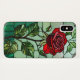Die rote Rose ist aus gepolstertem Glas mit grünen Blätter, Set vor einem Hintergrund aus weichem, strukturiertem Grün. Das aufwändige Design wird durch dekorative Ränder gerahmt, was die künstlerische Schönheit des Stückes verstärkt.
