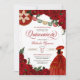 Quinceañera Einladung in rubinrote rote Rose mit goldenen Akzenten und papel picado bunting Banner, Charro Hut und schöne charra Prinzessin Ball Gown Kleid. Karo den Shop für diese Einladung mit Mädchen in verschiedenen Haarfarben und Hautfarben.