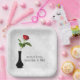 Rote Rose in Vase auf weißem Damast Pappteller