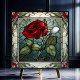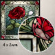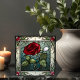 Die Rote Rose mit Keramik-Tile aus Weinbräunen mit festgeklemmtem Glass besticht durch eine elegante Single-rote Rose auf graublau-grauem Hintergrund mit einer Rose-Weinrebe. Diese Kachel hat ein antikes Buntglas-Aussehen im Jugendstil. Dieses Design ist auch in einem Spiegelbild verfügbar. Es gibt viele wunderbare Anwendungen für diese schönen Fliesen. Erhältlich in 2 Größen 4,25" x 4,25 " und 6" x 6".