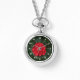 Ein Foto einer rote Rose in einem Garten. Die Blüte ist vollständig offen und zeigt die gelben Stiele der Mitte. Hinter der Blume wachsen rote Knospen. Der Hintergrund ist voller grüner Blätter. Für dieses Blume-Bild gibt es eine weiße Stunden- und Minuten-Uhr. Image Copyright ©Kimberly J Tilley.