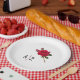 Hochzeitspapier-Teller mit rote Rose-Design. Fügen Sie die ersten Buchstaben-Initialen des Paares in schwarzem, gedrucktem Text hinzu. Eine dünne, rote vertikale Linie teilt die Buchstaben. Wählen Sie runde oder quadratische Teller in der gewünschten Größe aus.