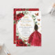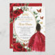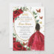 Personalisieren Sie diese hübsche rote Blumenladen Quinceañera / Sweet 16 Geburtstag Einladung einfach und schnell. Klicken Sie einfach auf die Schaltfläche "Weitere Einstellungen", um die Texte zu bearbeiten, Schriftart und Schriftart zu ändern. Mit einem Mädchen in einem schönen glitzernden roten Ball, lebendigen rote Rosen, Schmetterlinge und einem vergoldeten ovalen Raum gekleidet, um alle Ihre wichtigen Feierlichkeiten Details. Matching-Elemente im Speicher verfügbar. c) Somerset Fine Paperie