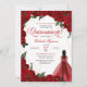 Quinceanera Einladung in rubinrote rote Rose mit goldenen Akzenten und ein Mädchen mit elegantem Ballkleid. Karo den Shop für diese Einladung mit Mädchen in verschiedenen Haarfarben und Hautfarben.