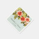 Romantische und moderne Hochzeitsnapkins mit roten Aquarellfarben, grünem Blattwerk auf einem Minzhintergrund.