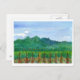 Eine Postkarte mit einem Aquarellbild eines Weinberges im kalifornischen Napa-Tal im Frühjahr, mit Rose, die am Ende jeder Weinreihe mit grünen Bergen und einem klaren blauen Himmel blühen.