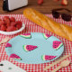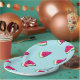Die Abbildung zeigt lebendige Wassermelonen-Scheiben, die spielerisch auf einem hellblauen Hintergrund angeordnet sind. Jede Scheibe zeigt reiche grüne Rinds und saftig rosa Fleisch, mit glänzenden schwarzen Samen überzogen. Das Design strahlt eine fröhliche, sommerliche Atmosphäre aus und ist ideal für Ansammlungen und Picknicks im Freien. Der Kontrast zwischen den lebendigen Wassermelonen-Farben und dem beruhigenden blauen Hintergrund schafft ein einladendes und erfrischendes Gefühl, das diese Teller für jede lustige Veranstaltung ideal macht. Das Gesamtbild ist skurril und ansprechend, um jeden Tisch angenehmer zu gestalten!