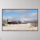 Dieses Poster bietet eine schöne ländliche Winterlandschaft. Rote Scheunen und ein Silo sind von schneeweißen Feldern umgeben, durch die sich nur die Stuble des Mähhaies zeigt und ein blauer Himmel mit flauschigen weißen Wolken.