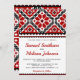 Überraschen Sie Ihre Gäste mit dieser eleganten Hochzeitseinladung, die eine schöne Volkskunst gegen einen weißen Hintergrund kennzeichnet. Fügen Sie einfach Ihre Ereignisdetails über diese bedienungsfreundliche Schablone hinzu, um es eine einzigartige Einladung zu machen. Drehen Sie die Karte vorbei um, um ein traditionelles ukrainisches Volksmuster auf der Rückseite der Karte aufzudecken.