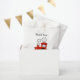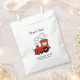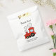 Niedliche rote Spielzeugzug Baby Dusche Gastgeschenk Taschen für neue Baby Junge. Personalisiertes Party für Babydusche, Geburt oder Schwangerschaft. Fügen Sie Ihren eigenen Namen des Kindes / Neugeborenen und danke für die kommende Nachricht. Sympathische, whymsikalische Typografie Vorlage. Benutzerdefinierter Hintergrund Verteilen Sie selbst gemachte Süßigkeiten, hausgemachte Konditoreiwaren, Fudge-Süßspeisen, Kuchen, Kuchen, Backkuchen, Donuts und andere Fingerfood-Gäste. Spaß Eisenbahn Lokomotive Illustration für Kinder.