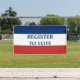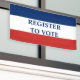 Die Stimme ist in blauem Text in der Mitte dieses Outdoor-Banners. Oben ist ein blauer Streifen. Ein roter Streifen ist unten. In der Mitte ist ein weißer Streifen. Sie können die Wörter auf Wunsch ändern.