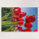 Rote Tulpen blühen an einem blauen Frühlingstag