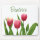 Ein Set roter Tulpen Blume blühen auf einem weißen Hintergrund mit Ihrem eigenen Namen in einem grünen Schriftart mit Skripten.