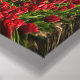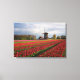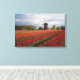 Leinwand Landschaftsbild einer Frühjahrslandschaft mit einem Feld mit roten Tulpen und anderen Blume und einer Windmühle beim Sonnenaufgang im Keukenhof Gärten, Bulb Region, Niederlande. Eine farbenfrohe Dekoration an der Wand!