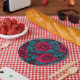 Handgezeichnetes Vektormuster mit rote Rosen mit blauen Blätter