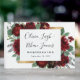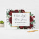 Die Einrichtung besteht aus Aquarellpeony und Rose Blumenelementen in Rot- und Bordeauxtönen über eukalyptus botanischer Vegetation. Die Vorlage verfügt auch über eine goldfarbene Box für ein elegantes Layout. Die Typografie zeigt ein modernes Layout mit schwarzem Text. Sehen Sie sich den Link zur Sammlung auf dieser Seite an, um passende Produkte im Hochzeitsfest-Set zu finden.