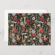 Diese Postkarte hat rote, grüne und bräunliche Pilze und Blume auf schwarzem Hintergrund.