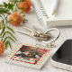 Der niedliche Schlüsselanhänger hat einen Hintergrund aus rot und grün springenden Rentieren und Schneeflocken. Sie laden Ihr Lieblings-Foto Ihres Haustieres oder Ihres Kindes mit der einfach zu verwendenden Vorlage hoch. Ihr Foto wird mit einem roten Streifen begrenzt und es ist ein hübscher roter Bogen in der Ecke. Die Rückseite des Schlüsselanhängers hat das rote und grüne Rentier- und Schneeflockenmuster. Dies würde ein niedliches kleine Geschenk für ein Familienmitglied machen.