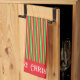 Breite, rote und grüne Streifen, schmale weiße Linien, die sie trennen, schaffen ein schönes Küchentuch. Perfekt für Ihre Zuhause, und nicht so offensichtlich Weihnachten orientiert, sodass es ganzjährig genutzt werden kann. Personalisieren Sie Ihren Urlaub mit einem Gruß oder Namen in einer breiten, roten Band am unteren Ende.