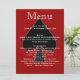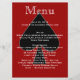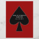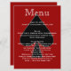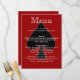 Hochzeits-Empfangsmenü der Spielkarte des Spaßes themed. Grafiken eines großen schwarzen Spatensymbols verziert den dunkelroten Hintergrund, mit dem kundenspezifischen weißen Text, der bereit ist, für Ihre Hochzeit zu personifizieren. Wunderliches Hochzeitsmenü groß für Alicen im Wunderland, spielendes Thema und Vegas-Hochzeiten auch.