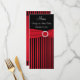Diese rot und schwarz gestreifte Menükarte mit passendem Farbband und Schmuck aus roten Imitaten passt zu der unten gezeigten Einladung. Es ist auf einer Rackkarte konzipiert, sodass die Vorderseite glänzend und die Rückseite matt ist. Wenn Sie eine Menükarte auf Einladungspapier wünschen, um Ihren Einladungen zu entsprechen, oder wenn Sie Wünsche für zusätzliche Elemente oder Änderungen haben, senden Sie bitte eine E-Mail an niteowlstudio@gmail.com mit Ihrer Anfrage.