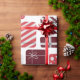 Ein nahtloses Muster mit einer Vielzahl von Geschenkboxen, die in Rot, Weiß und Mond eingewickelt sind, mit festlichen Mustern wie Streifen, Polka-Punkte und Karos. Jedes Geschenk ist mit einem einfachen schwarz-weißen Bogen verbunden, der Kontrast und Charme verleiht. Der Mix aus geometrischen Designs und lebhaften Ferienfarben erinnert an eine fröhliche, feierliche Stimmung, die perfekt dazu geeignet ist, das Wesen des saisonalen Geschenks zu erfassen.