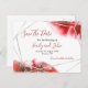 Eine bequeme Möglichkeit, Ihre Gäste Save the Date fragen, ist die Postkarte. Dieses elegante Design hat eine schwarz-rote Typografie mit einem silbernen geometrischen Rahmen auf der abstrakten, roten Wasserfarbe an zwei Ecken. Text ist leicht personalisiert und Sie können die Hintergrundfarbe ändern, wenn Sie möchten.