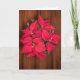 Schöne, rote Weihnachtsfeier auf braunem Hintergrund auf Grußkarte. Du musst wissen, dass du ein Foto bekommst!