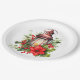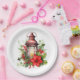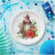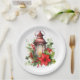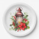 Papier Teller mit einem gemütlichen Weihnachtsbild mit einer roten Laterne umgeben von Kiefer und eine Poinsettia und heilig.
