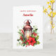 Geburtstagskarte mit einem gemütlichen Weihnachtsbild mit einer roten Laterne, umgeben von Kiefern und Poinsettia und Heiligen.