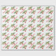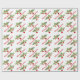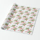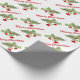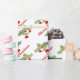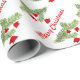 Rote Weihnachtsmannmütze Ornamente auf Kiefernzweig Weihnachtswrapping Papier. Kiefernäste mit lustigen Weihnachtsmannmützen-Ornamenten und fröhlichem Weihnachtstext.