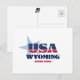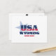 Wunderbare Postkarte. Ein kreatives Typografie-Design, das Wyomings Essenz mit kühnen Rot-, Weiß- und Blautönen und patriotischen Elementen, einschließlich US Flagge, verkörpert.