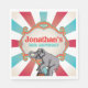 Feiern Sie den großen Tag Ihres kleinen Kindes mit dieser einzigartigen, roten, aquamarinen blauen Geburtstagszeitung Serviette aus Vintagem Zirkus, die handgezeichnete Elefantenkunst und einen Vintagen Rahmen bietet. Personalisieren Sie mit dem Gast von Ehrenname und Geburtstag.