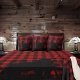 Ein kariertes Winterkissen mit rotem und schwarzem Büffel mit einer schwarzen Silhouette eines großen Waldschwarzbären in einem ruhigen Waldkiefernwald mit einem karierten Hintergrund aus rotem und schwarzem Büffel.