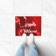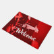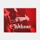 Rote elektrische Bass-Gitarrist-Fußmatte. Die Hände des Bass-Spielers auf dem Hals eines kundenspezifischen Basses. Der Text liest das traditionelle Willkommen, aber Sie können es zu allem ändern, das Sie mögen. Ein wunderbares Willkommen zu Ihrem Zuhause oder zu Studio oder ein großes Geschenk für Ihren Lieblingsbass-Spieler, Musiker oder Musikliebhaber.