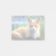 Sticky Notizen mit einem farbenfrohen Bild von einem roten Fuchs, der in grünen Gräsern liegt. Diese niedliche Kreatur hat weiches Fell und sanfte Augen. Bild hat ein traumhaftes magisches Gefühl.