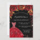 Eine moderne, stilvolle und glamouröse Einladung zu einer Quinceañera, 15. Geburtstagsfeier. Schwarzer Hintergrund mit roten Imitaten Glitzer Staub, ein Kleid und rote Rosen, Blumenmuster. Der Name ist mit einem modernen handgeschriebenen Stilskript geschrieben. Personalisieren Sie Ihre Party-Daten und fügen Sie sie hinzu.