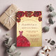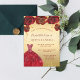 Eine moderne, stilvolle und glamouröse Einladung zu einer Quinceañera, 15. Geburtstagsfeier. Ein Imitat goldener Hintergrund mit Imitaten goldenen Glitzer Staub, ein Kleid und rote Rosen, Blumensträuße. Der Name ist mit einem modernen handgeschriebenen Stilskript geschrieben. Personalisieren Sie Ihre Party-Daten und fügen Sie sie hinzu.