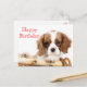 Diese lustige Kaninchenpostkarte zeigt ein Bild eines bräunlichen und weißen Cavalier King Charles Spaniel Welpenhundes mit ihren Pfauen auf einem Korbkranz aus Holz, der auf einem knusprigen, weißen Hintergrund hervorgehoben wurde und in einem fett gedruckten, handgeschriebenen Schriftart mit Happy Birthday gedruckt wurde.