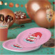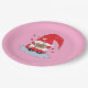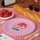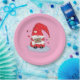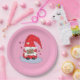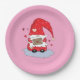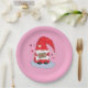 Ein paar Teller aus süß rosa Papier mit einer Gnome, die ganz in Rot gekleidet sind und einen Buchstaben halten, und eine Liebe verschütten. Suchen Sie nach den passenden Papierservietten.