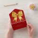 Roter Hintergrund, mit einem großen goldenen Bogen verziert. Personalisieren und hinzufügen von Namen, Party-Details, UAWG, Rücksendeadresse und Namen.