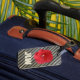 Eine kühn rote Hibiskus-Blume auf einem stilvollen Gepäckanhänger mit modernen monochromatischen Streifen in glatten Grautönen, personalisiert mit fett formatierten Initials, ist ein einzigartiges und raffiniertes Reisezubehör. Das ist die ursprüngliche botanische Fotografie von JLW_Fotografie.