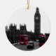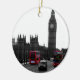 London-Reisebusse und Big Ben, diese Fotografie hat zwei London-Reisebusse im Vordergrund, die in der roten Farbe mit Big Ben und dem London-Hintergrund in einem unscharfen Schwarzweiss sind.