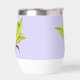 Ein niedlicher mit Augen Baumfrosch sitzt auf drei Blätter vor einem lila Lichtklima